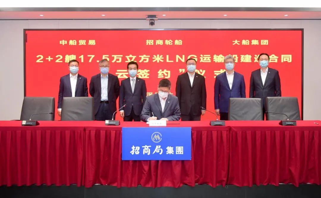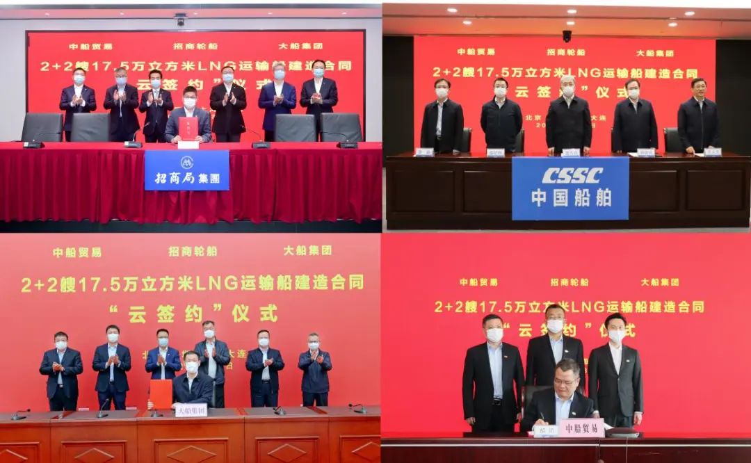 31 March 2022 – CMES Shipping operating under China Merchants Group (CMG) signed online a shipbuilding contract for 2+2 large LNG carriers with Dalian Shipbuilding Industry Company Limited (DSIC) and China Shipbuilding Trading Company Limited (CSTC) under China State Shipbuilding Corporation Limited (CSSC) in Shenzhen, Shanghai, Dalian and Beijing. CMG's Chairman Miao Jianmin, President Hu Jianhua and Director Wang Hong were joined by CSSC's Chairman Lei Fanpei, President Yang Jincheng and President Sheng Jigang to witness the signing process.