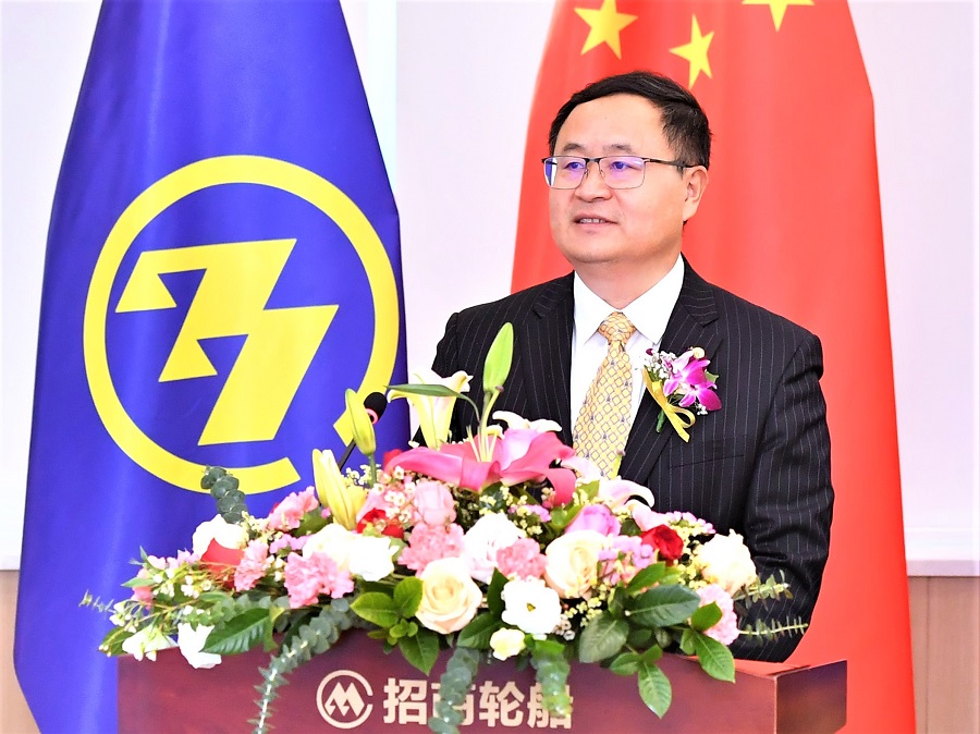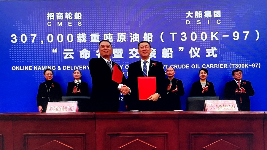 10 December 2021, the naming and delivery ceremony of the 307,000-ton ultra-large intelligent crude oil tanker (T300K-97), which was built jointly by CMES Shipping and Dalian Shipbuilding Industry Company (DSIC), was held in Shenzhen, Shanghai and Dalian. Hu Jianhua, President of China Merchants Group, attended the ceremony and named the new vessel. Sun Wei, Vice General Manager of China CSSC Holdings Limited, Yang Zhizhong, Chairperson of DSIC, Lin Jiming, Vice General Manager of DSIC, Yan Wushan and Ding Lei, Vice President of CMES Shipping, Kong Kang, Secretary of the Board of Directors, Hu Bin, Assistant General Manager and General Manager of AMCL, Wu Jianyi, Chief Engine Officer and Associate Safety Director, and Li Zengzhong, Chief Captain and Safety Director, attended the ceremony. Ms Zhao Juan, Assistant General Manager and Securities Representative of the Board Office of CMES Shipping, cut off the rope tied to the new vessel.