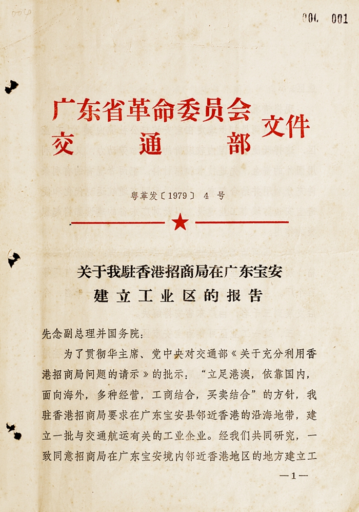 中共中央副主席、国务院副总理李先念的批示 1979年1月10日,招商局代交通部和广东省革委会起草致国务院的《关于我驻香港招商局在广东宝安建立工业区的报告》,得到了国务院的批准。1月31日,交通部副部长彭德清和招商局袁庚常务副董事长带着一张香港明细全图向中共中央副主席、国务院副总理李先念和副总理谷牧汇报,李先念副主席用红铅笔在中国深圳南头半岛上划了一个圈,允许招商局自筹资金在这里开发新中国第一个对外开放的工业区——蛇口工业区,在这个不到10平方公里的土地上,打响了改革开放的第一炮,从此打开了中国的大门。招商局也从蛇口迈出了实现第二次辉煌的第一步.