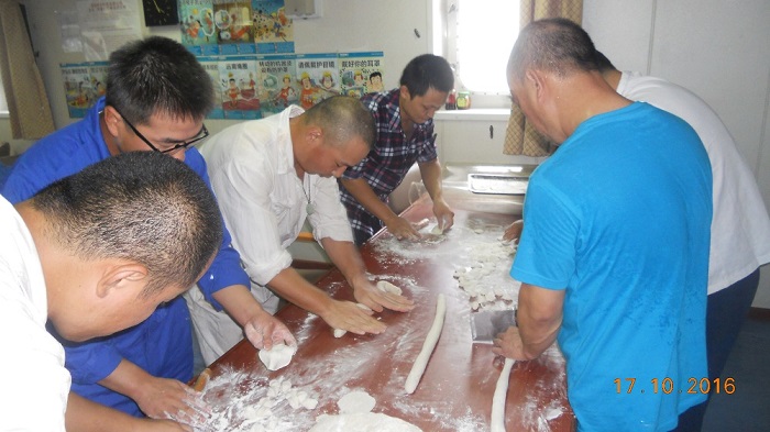 明舟轮从万里之遥传回的全家福带来满满的正能量——全体船员精神抖擞地展示国旗和船旗。在学习招商历史和举办文娱活动后,他们开始了喜庆的重头戏:“家人”齐和面,同心包饺子!