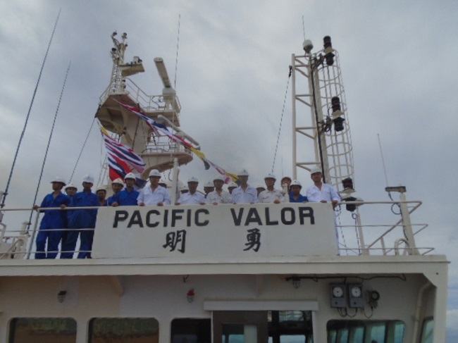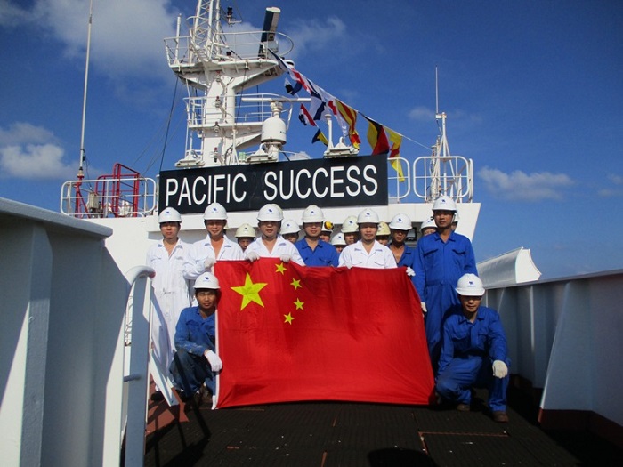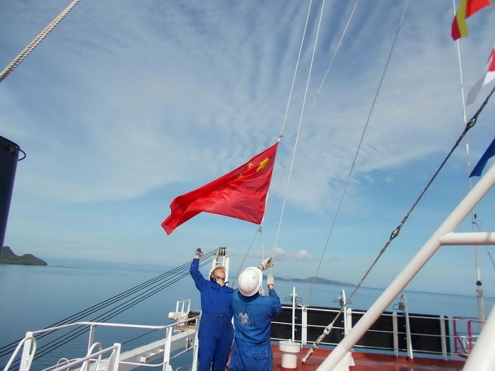 明勇轮全体船员手持国旗,登上最高甲板,让镜头定格了公司日的欢乐!