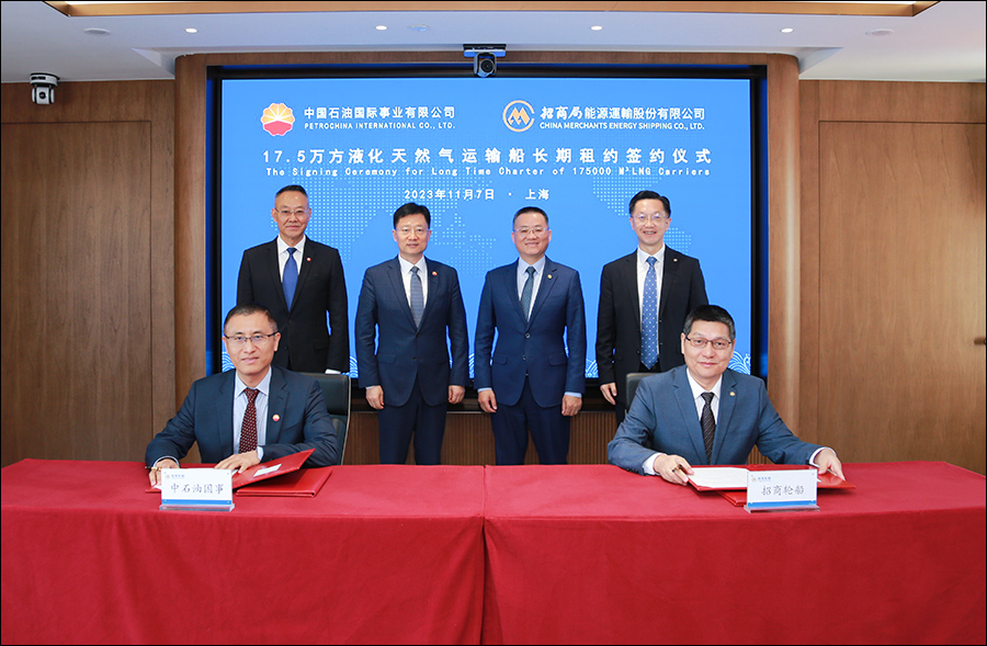 11月7日,第六届中国国际进口博览会期间,招商轮船与中国石油国际事业有限公司(以下简称:中石油国事)在上海举办2艘17.5万方液化天然气运输船长期租约签约仪式。招商局集团副总经理、招商轮船董事长冯波鸣,中国石油天然气股份有限公司副总经济师、中石油国事执行董事武军利出席仪式并致辞。