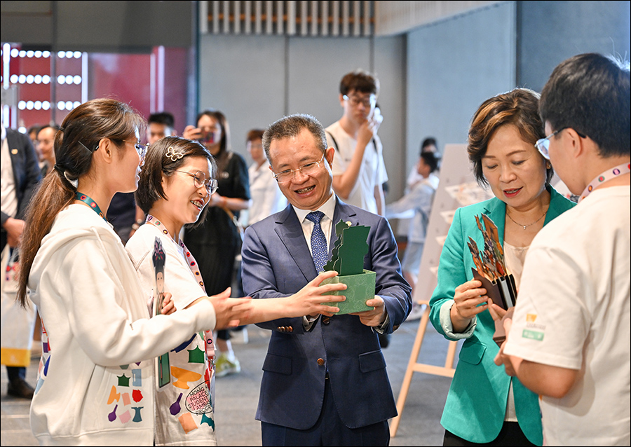 本届项目还首次举办“学生文化大使日”,50多名学生文化大使担任展览导赏员、访客服务员、文创产品大使等,亲身参与博物馆营运,与访客互动交流,丰富其参观体验。钟国东与其他嘉宾参观学生文化大使所在服务岗位,了解服务内容及进展情况,并为学生们加油鼓劲。