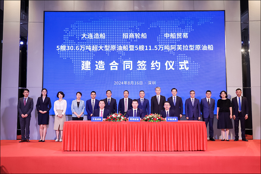 8月16日下午,招商局集团旗下招商轮船与中国船舶集团有限公司(以下简称“中国船舶集团”)旗下大连船舶重工集团公司(以下简称“大连造船”)、中国船舶工业贸易有限公司(以下简称“中船贸易”)在深圳举行5艘30.6万吨超大型原油船暨5艘11.5万吨阿芙拉型原油船建造合同签约仪式。招商局集团副总经理、招商轮船董事长冯波鸣,中国船舶集团副总经理盛纪纲出席并见证签约。