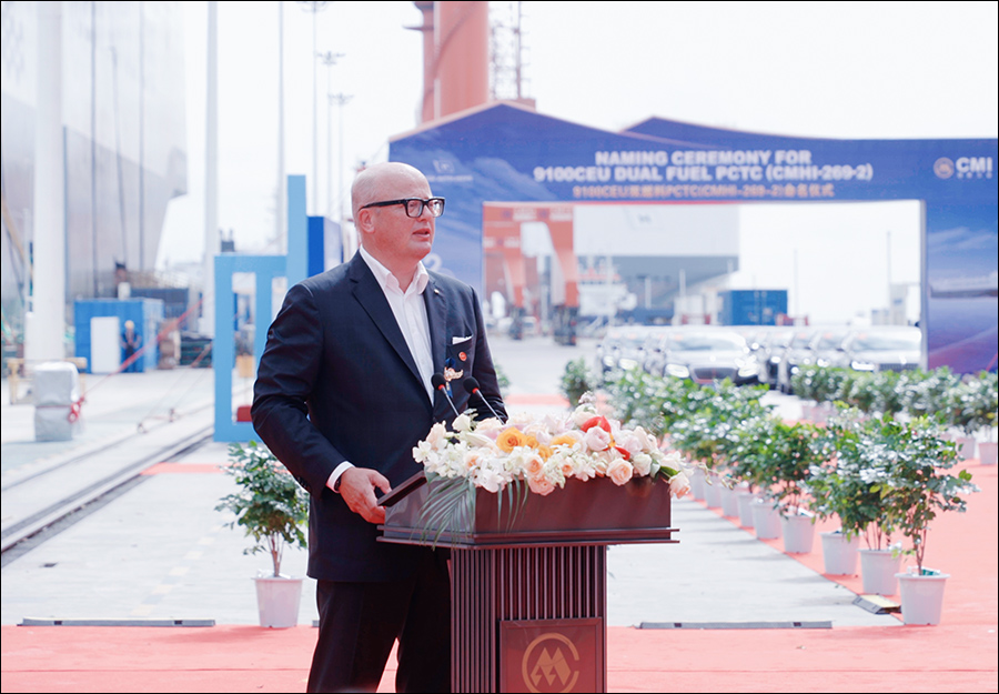 Leif O. Høegh在致辞中分享了双方合作的愉快经历,并对招商工业给予高度赞赏。他表示,“极光级”9100车PCTC系列船与绿色、创新深度融合,不仅代表了当前汽车滚装船设计的最高水平,更是双方团队智慧与汗水的结晶。他期待在双方的努力下,塑造一个联系更紧密、更繁荣、更可持续的未来。