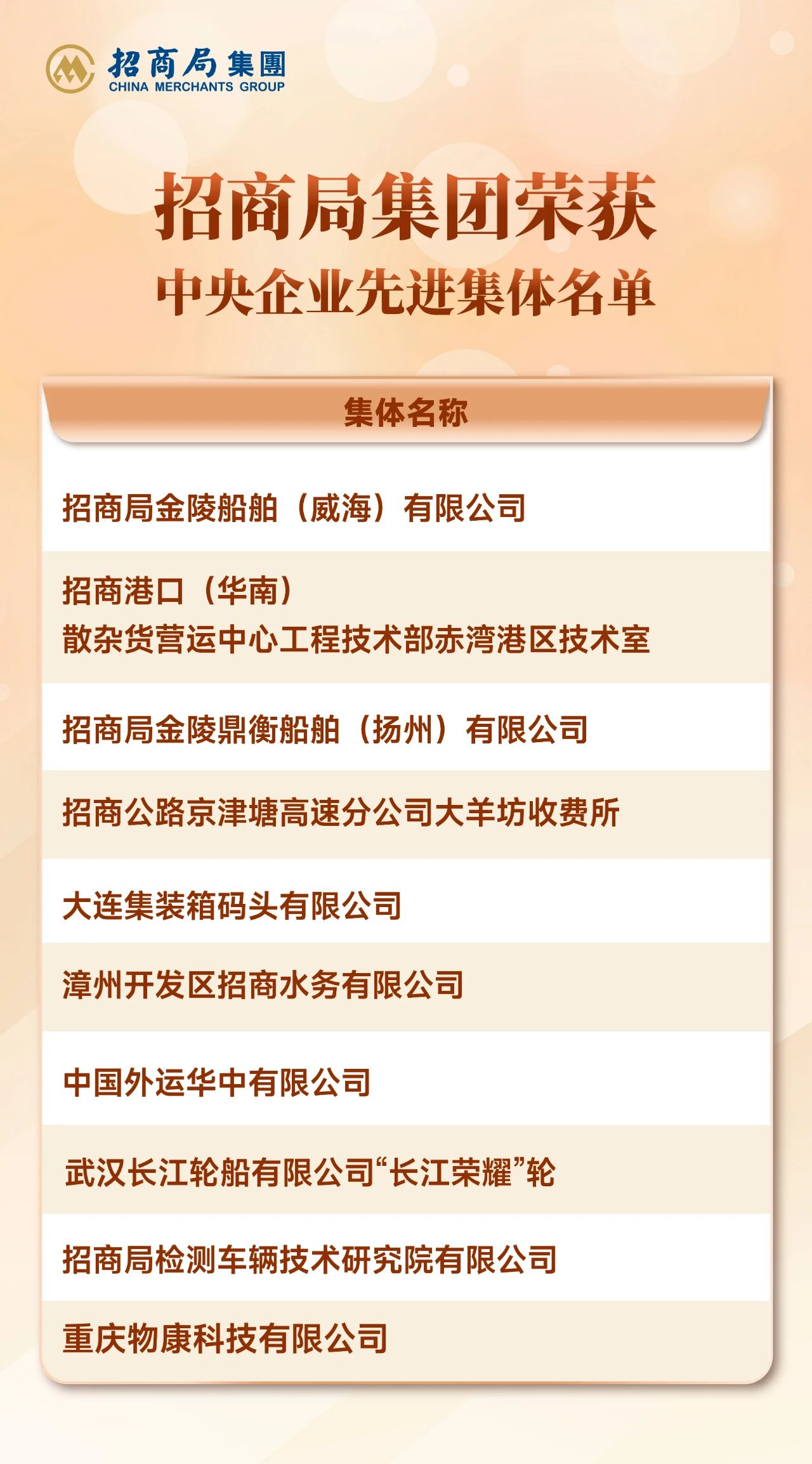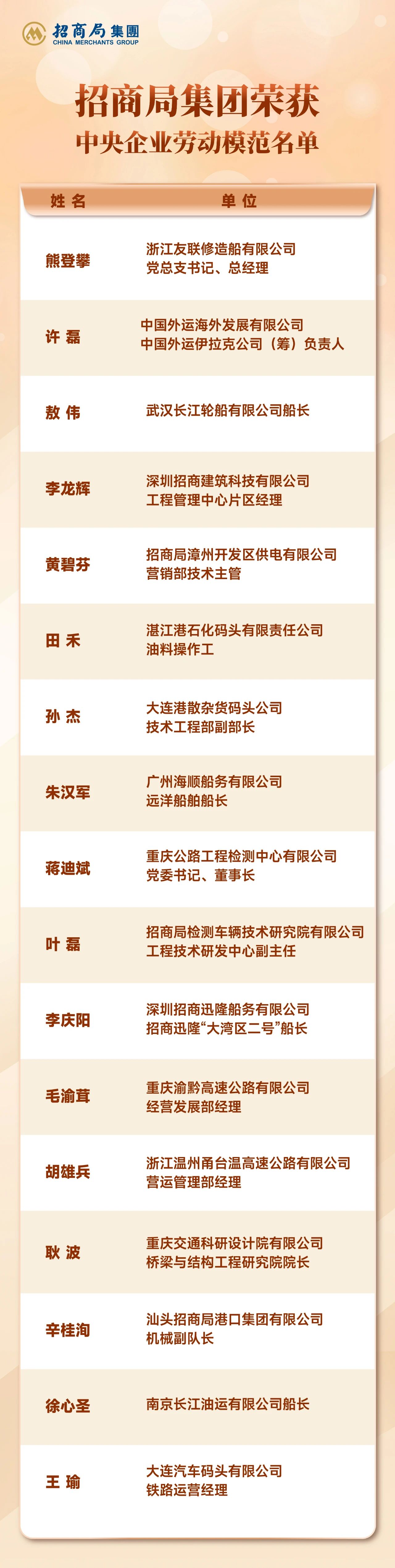 本次大会共表彰了491个中央企业先进集体和792名中央企业劳动模范,其中,招商局集团共10个集体获得“中央企业先进集体”荣誉称号,17名个人荣获“中央企业劳动模范”称号。