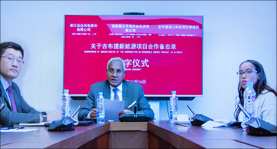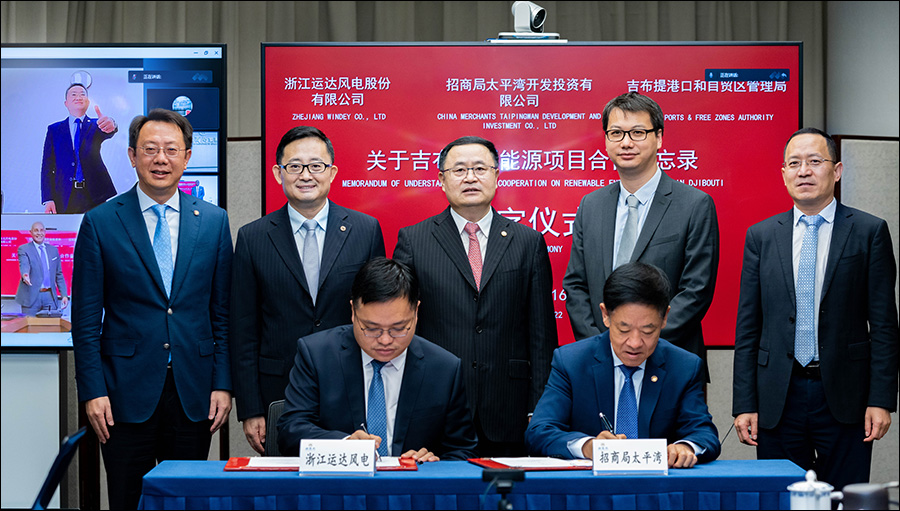 11月16日下午,招商局太平湾开发投资有限公司(以下简称“招商局太平湾”)、浙江运达风电股份有限公司(以下简称“运达股份”)与吉布提港口和自贸区管理局通过视频连线的方式,签订了关于吉布提新能源项目合作的备忘录。招商局集团总经理胡建华、副总经理冯波鸣与吉布提港口和自贸区管理局主席阿布巴卡分别在深圳、香港和吉布提三地见证签约。招商局集团总经理助理李亚东主持签约仪式。