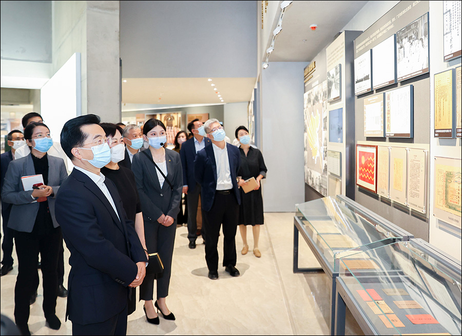 调研中,缪建民一行从博物馆序厅开始参观,沿博物馆规划展陈动线,逐一审阅了第一篇章“引领洋务 挽回利权”、第二篇章“国之巨擘 勇赴国难”、第三篇章“高举义旗 奠基航运”、第四篇章“改革春雷 开放先锋”、第五篇章“拥抱时代 再写华章”展陈重点内容及主要呈现效果。新馆展陈详尽地展示了招商局创立150年来追寻民族富强、推动实现国家现代化的风雨历程,以及新时代融入国家发展大局、以招商所能响应国家所需、加快建设世界一流企业的使命担当。