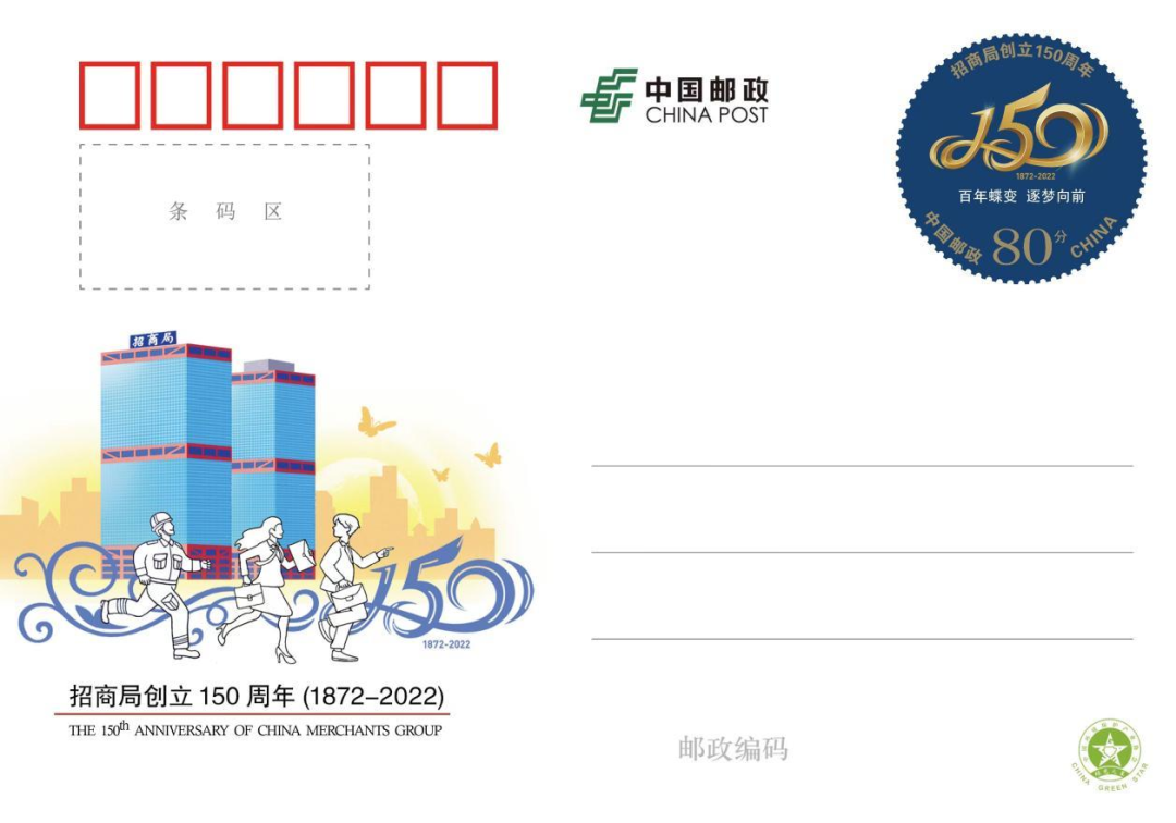 2022年招商局集团公司日,中国邮政发行JP271《招商局创立150周年》纪念邮资明信片一套一枚。纪念邮资明信片以“逐梦前行”为主题,采用现代简约风格,通过文字和剪影全面展现了招商局跨越三个世纪“乘风破浪、奋勇向前”的风貌。此外,在1992年和2002年中国邮政曾分别发行招商局120周年和130周年纪念邮资封。