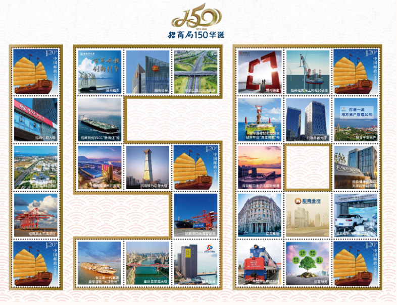 这版“150”个性化邮票,通过30幅图片拼接出数字“150”,纪念招商局创立150周年。其中,不含邮资的25枚附票呈现了招商局交通物流、综合金融、城市与园区综合开发等核心产业和大健康、检测等新兴产业,在港口、航运、物流、公路、银行、投资、园区开发等多个领域的发展。