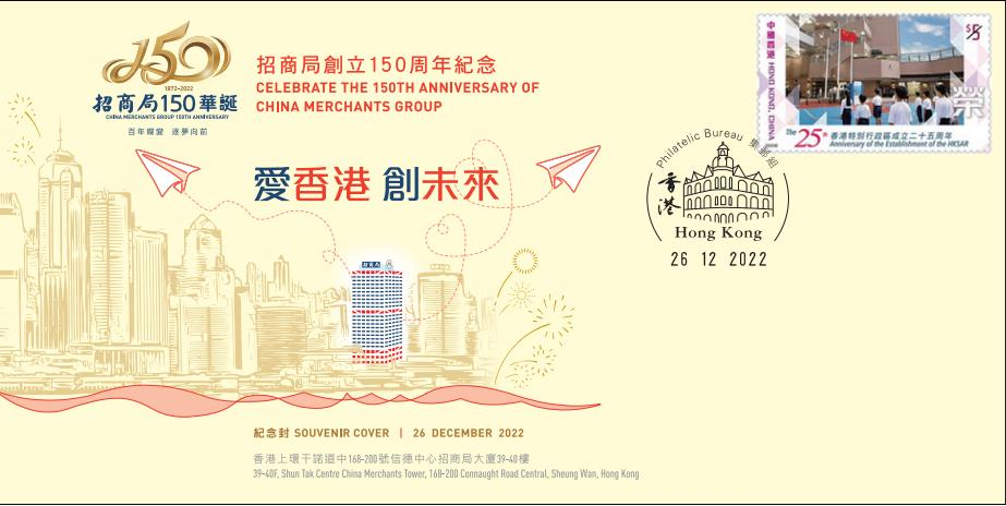 《招商局创立150周年》香港纪念封以“爱香港 创未来”为主题,通过提取香港维多利亚港招商局总部大楼的剪影为背景主体,配有动感飞机和远方绚烂的礼花点缀,呈现欣欣向荣的景象,传递了招商局植根香港、积极融入香港,以商业成功与香港共创美好未来的决心和信念。