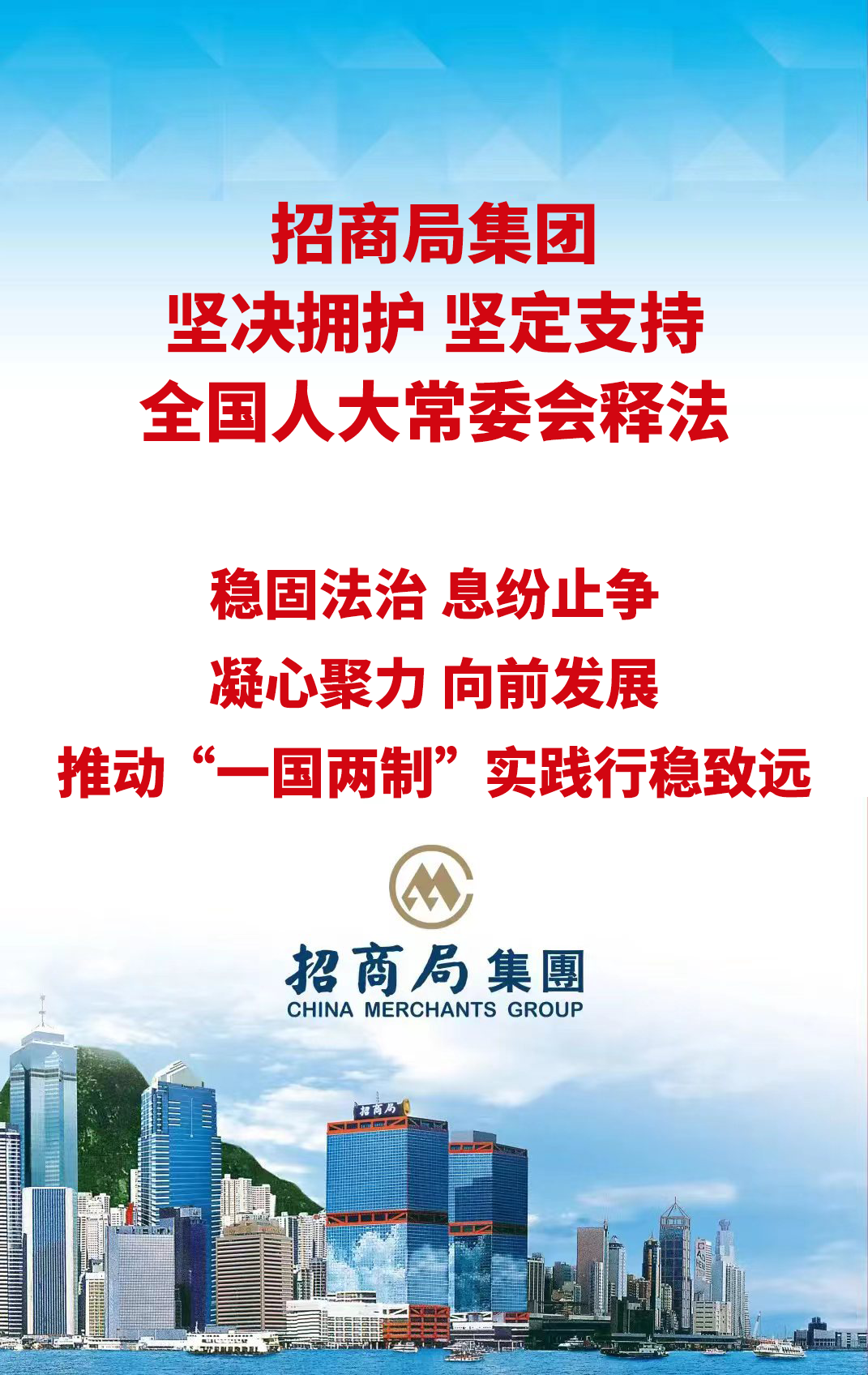 此次释法为推动香港凝心聚力、向前发展,创造了良好条件。作为驻港央企,招商局集团将携手香港各界共同努力,珍惜香港来之不易的良好发展局面,坚决维护国家主权、安全、发展利益,坚决维护香港国安法权威,依法履行维护国家安全的职责和义务,推动“一国两制”实践行稳致远。