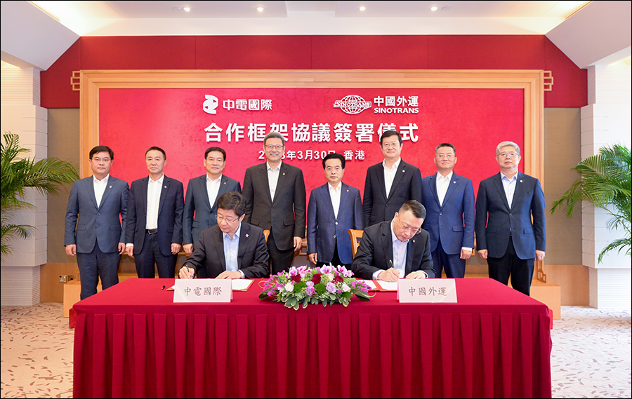 在缪建民、钱智民等共同见证下,中国外运总经理宋嵘与中电国际董事长王子超代表双方签署了合作框架协议。