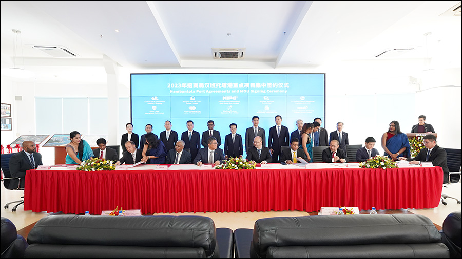23日上午,斯里兰卡汉班托塔港重点项目集中签约仪式举行,来自中国、新加坡、马尔代夫等国的9家企业与汉班托塔港签署入园合作协议,涉及仓储物流、免税店、海事服务、石油化工等领域。签约现场,还有5家企业举行了竣工、开工等仪式。缪建民与戚振宏大使出席仪式。