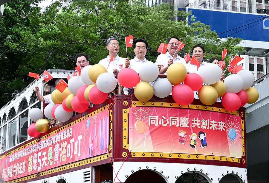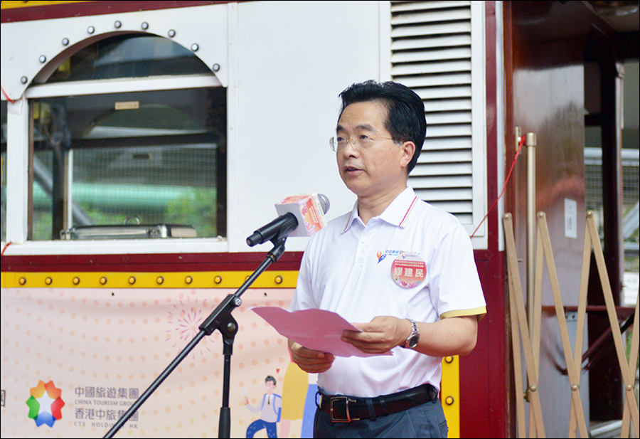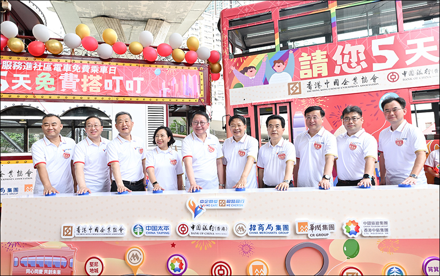升旗仪式结束后,香港中企协会会同会员企业在电车厂总部举办庆祝香港特区成立26周年暨“中企服务进社区”全港市民免费搭乘活动启动礼。香港特区政府政务司司长陈国基,香港中企协会会长、招商局集团董事长缪建民出席活动并致辞,香港中联办副主任尹宗华,香港民政及青年事务局局长麦美娟,香港中联办经济部部长徐卫刚,香港中企协会副会长兼总裁于晓,以及香港中企协会会员企业等有关负责人出席活动。