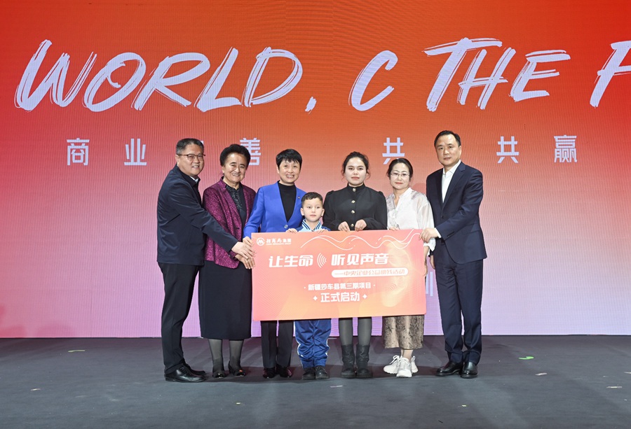 在石岱、李军和热孜万·艾拜等见证下,招商局慈善基金会携手新疆慈善总会启动中央企业公益助残活动之“让生命听见声音”新疆莎车县第三期项目。第二期项目的受助对象代表、莎车县特殊教育学校的学生伊卜拉伊木在母亲和老师的陪同下到现场分享自己安装了人工耳蜗后,第一次听到了声音、并开始学会说话的切身体会。