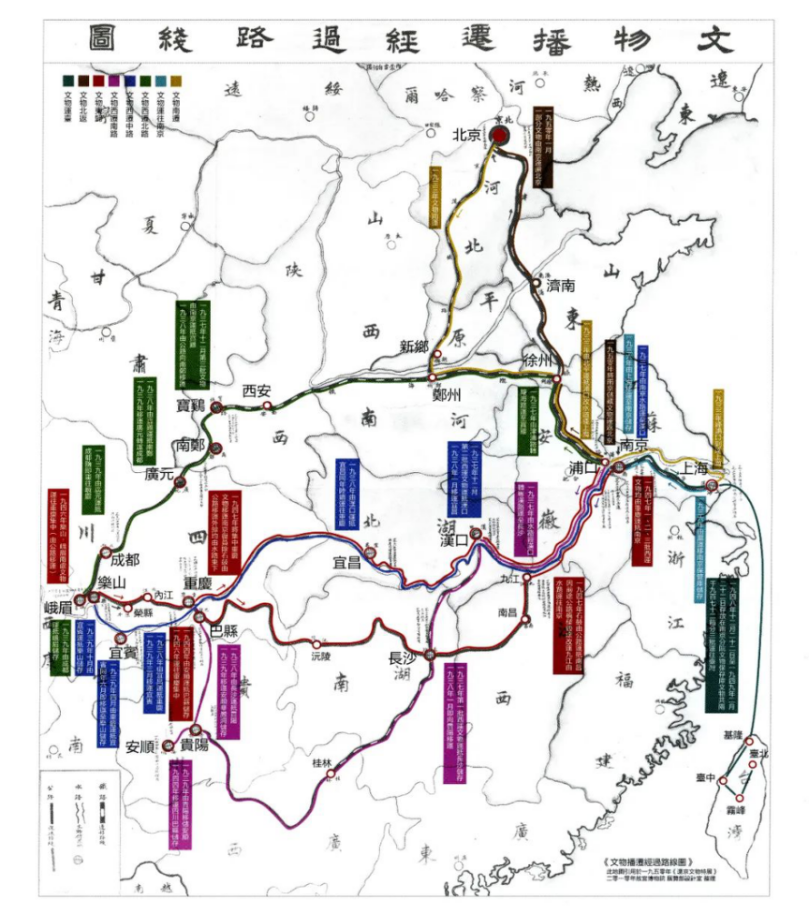 1937年,卢沟桥事变和淞沪会战相继爆发,文物分三路向西南地区疏散。南路文物溯江而上,初藏长沙,后取道湘桂公路,辗转于贵阳、安顺、巴县等地。北路文物沿陇海铁路西行,先存宝鸡,后穿越秦蜀古道,迁于汉中、成都、峨眉各处。中路文物沿江西上,初存汉口,中经宜昌转运重庆,又经宜宾转运乐山,秘藏于安谷。