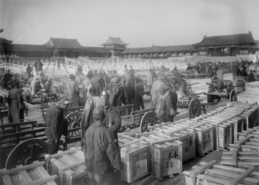 1933年,太和门广场上等待起运的文物箱件(图片来源: 故宫博物院)