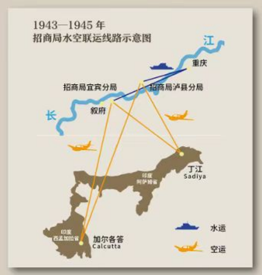 招商局承办的丁(丁江)叙(叙府)渝(重庆)水空联运,是盟国接济军火物资及出口贸易品的重要国际线路,保证了国外军用物资顺利抵达抗日前线