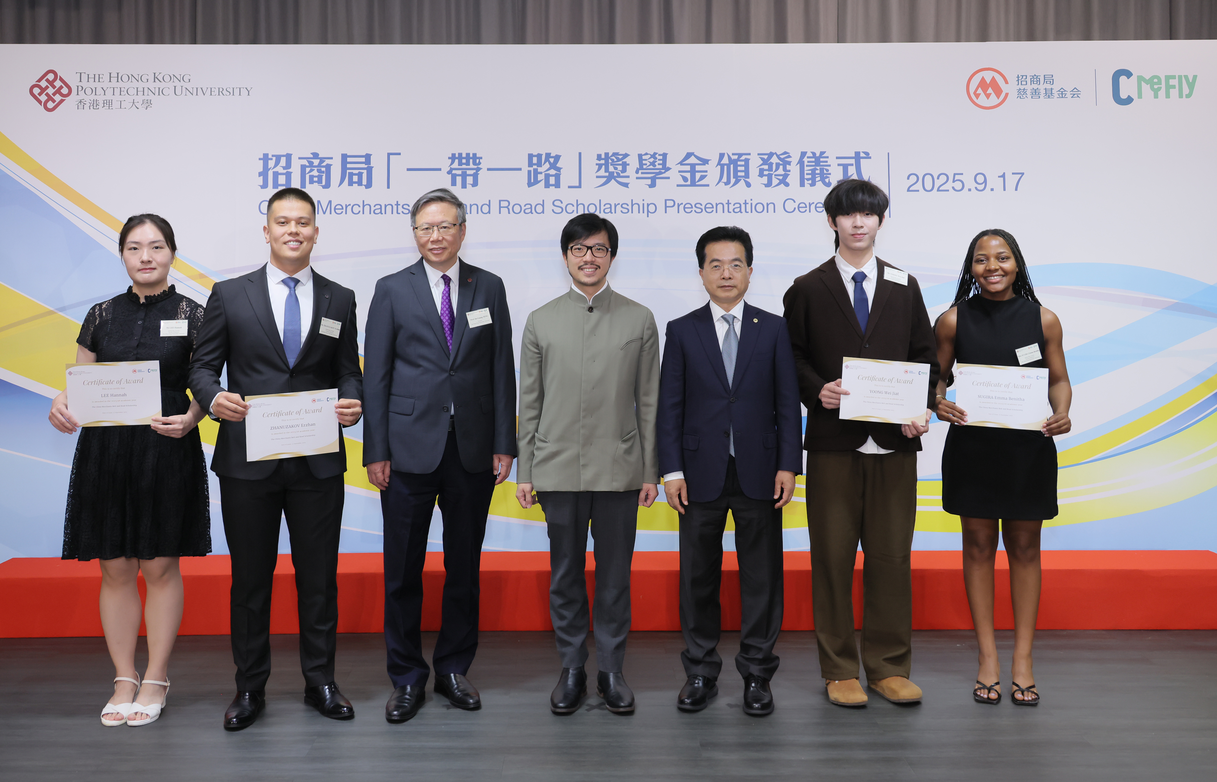 9月17日,由招商局慈善基金会在香港理工大学捐赠设立的招商局“一带一路”奖学金首届颁奖仪式举办。招商局集团董事长、招商局慈善基金会(香港)理事长缪建民,香港特区政府商务及经济发展局“一带一路”专员何力治,香港理工大学校长滕锦光教授担任活动主礼嘉宾并致辞,香港中国企业协会副会长兼总裁于晓,招商局集团总经理助理、招商局慈善基金会(香港)执行副理事长张军立出席活动。