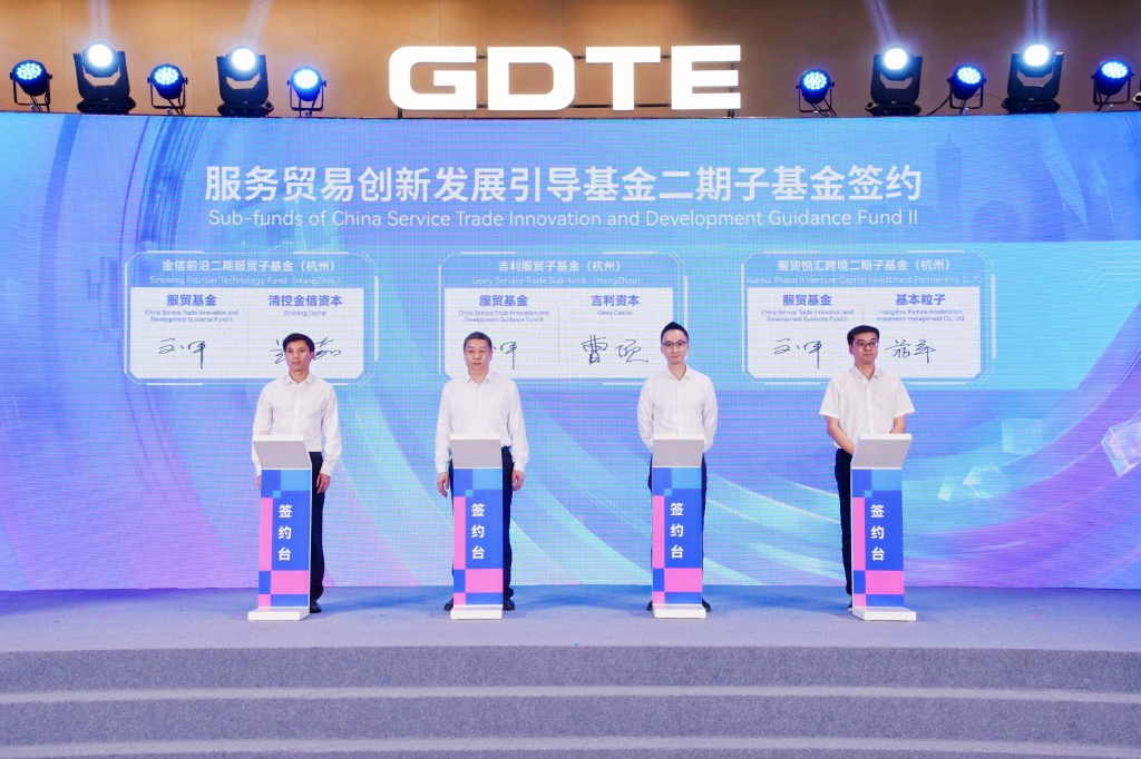 缪建民、盛秋平、姚高员、郭方明共同按下服贸基金二期启动键。启动仪式后,服贸基金二期签署了一批即将落地杭州的重点项目,助力杭州打造具有全球影响力的服务贸易强市。
