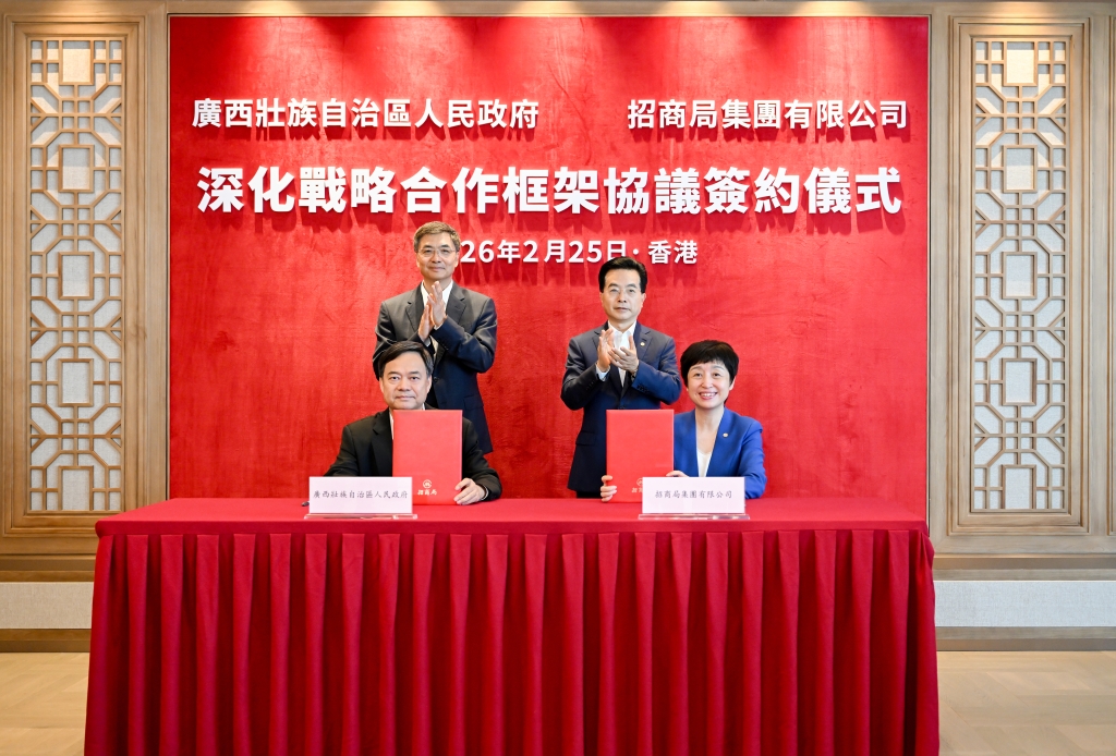 2月25日,招商局集团与广西壮族自治区政府在香港签署深化战略合作框架协议。招商局集团董事长缪建民与广西壮族自治区党委书记、自治区人大常委会主任陈刚会谈并见证签约。招商局集团总经理石岱与广西壮族自治区政协副主席、自治区党委秘书长周异决代表双方签署协议。招商局集团副总经理邓仁杰,集团总经理助理、董事会秘书,集团办公室主任张军立出席活动。