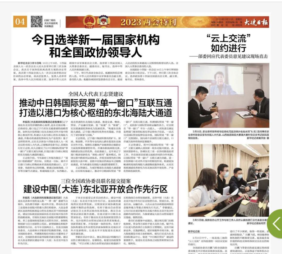 全国两会期间,在北京参加十四届全国人大一次会议的全国人大代表、辽宁港口集团党委书记、首席执行官王志贤,向大会提交了以中日韩国际贸易“单一窗口”互联互通为突破,打造以港口为核心枢纽的东北海陆大通道的建议,立足辽港所能,为服务辽宁全面振兴新突破和东北全面振兴建言献策。3月10日,《大连日报》“2023两会特刊”对王志贤所提建议进行了报道。