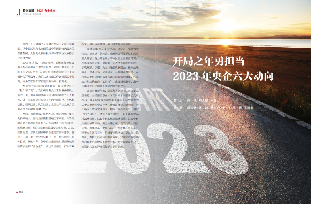 小新说:开新局有新气象,新征程有新担当。国务院国资委和中央企业全面贯彻党的二十大精神和党中央决策部署,扎实推进各项工作,为全面建设社会主义现代化国家开好局起好步贡献力量。《国资报告》深入分析各央企工作会议报告,推出特别策划《开局之年勇担当》,梳理2023年央企六大动向。小新为您全文分享——
