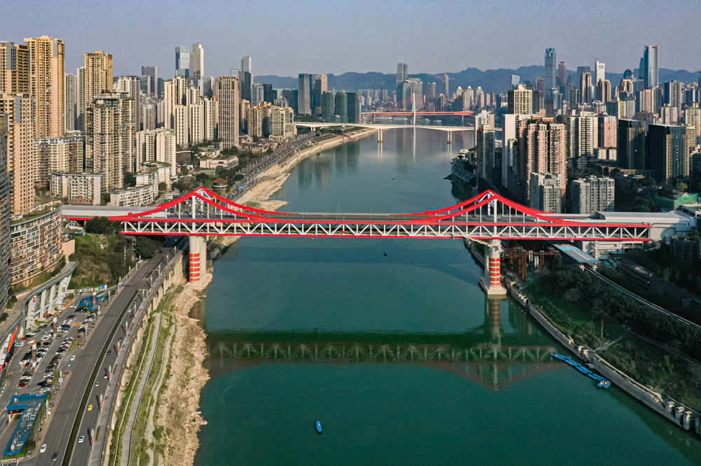 曾家岩大桥跨越嘉陵江,为主跨270米刚性悬索加劲钢析梁桥。虽跨径不大,但结构体系新颖,承载了多项领先技术:一是国内首座在桥上设置轨道换乘站的大跨径钢梁桥;二是国内首次在大跨径桥梁上设置调谐式减震浮置板式轨道道床,解决城市轨道交通噪声扰民问题;三是创新性采用短桩超薄封底工艺,解决大间距群桩基础超薄封底混凝土在高水头作用下的安全问题;四是大跨径桥梁首次采用顶升工艺实现一次落架达到成桥理想受力状态。