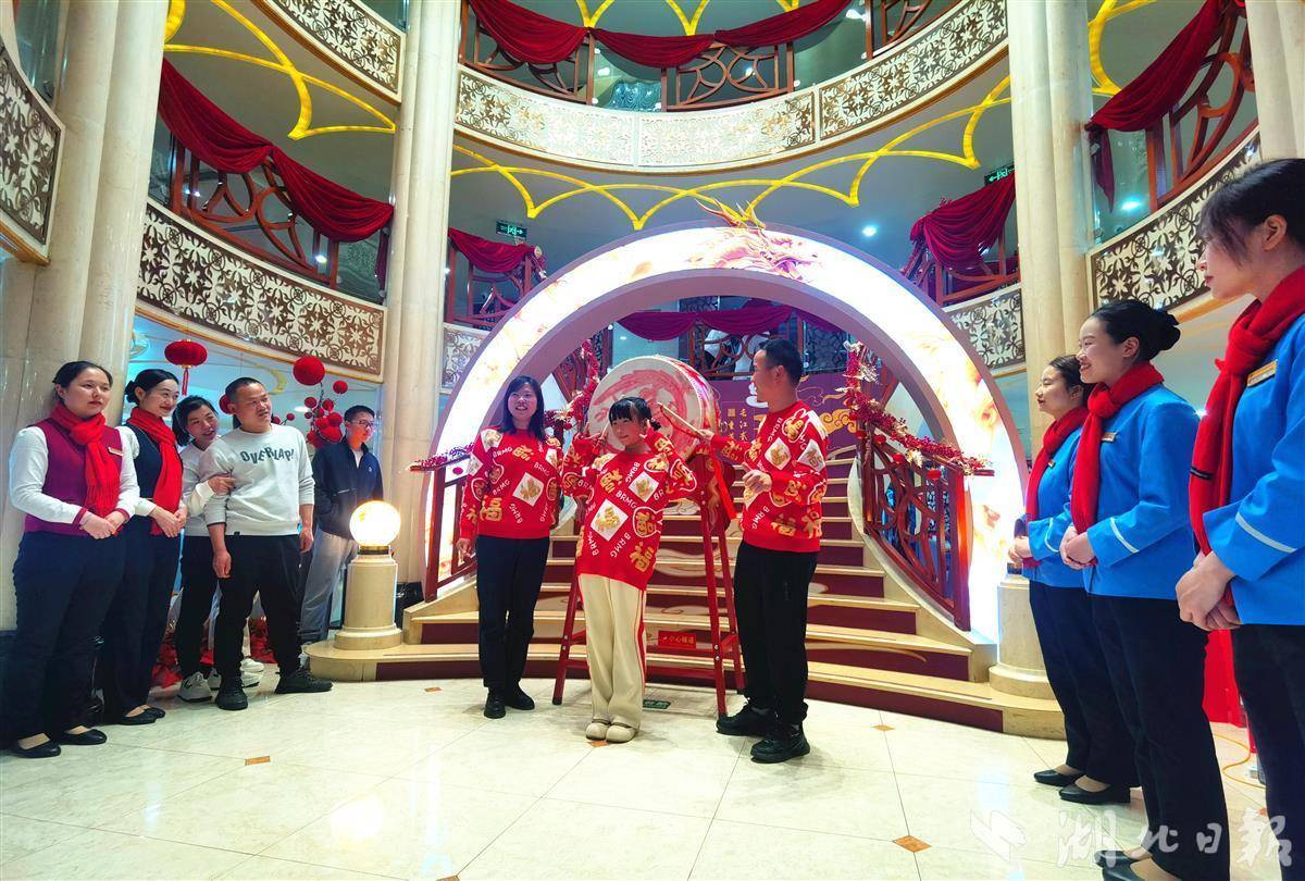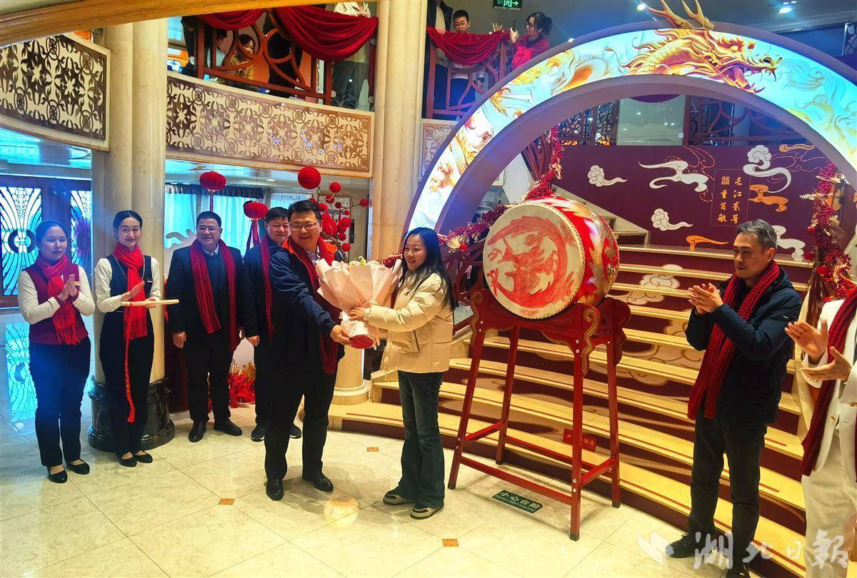 “龙鼓一响,平安吉祥!”大厅中央,一面硕大的龙鼓吸引客人纷纷敲鼓打卡拍照。身着白色船员制服的工作人员纷纷送上红围巾,并引导客人登记入住。