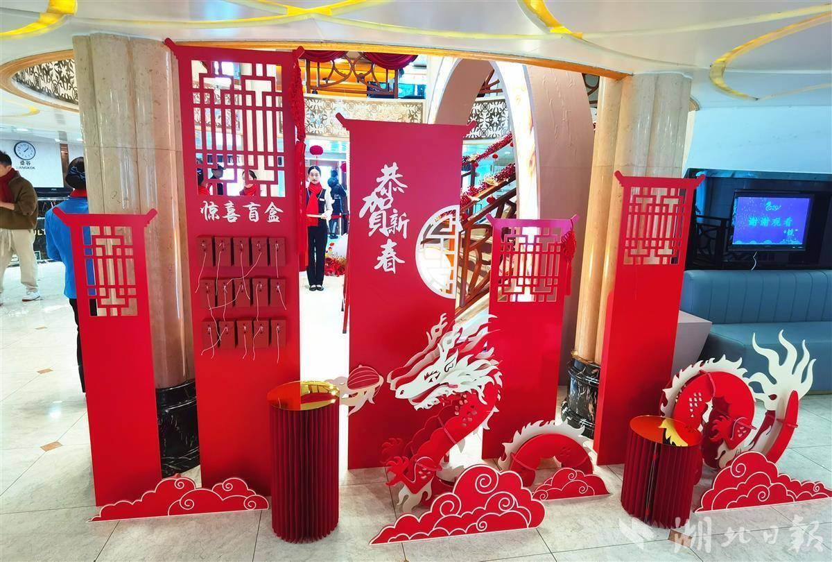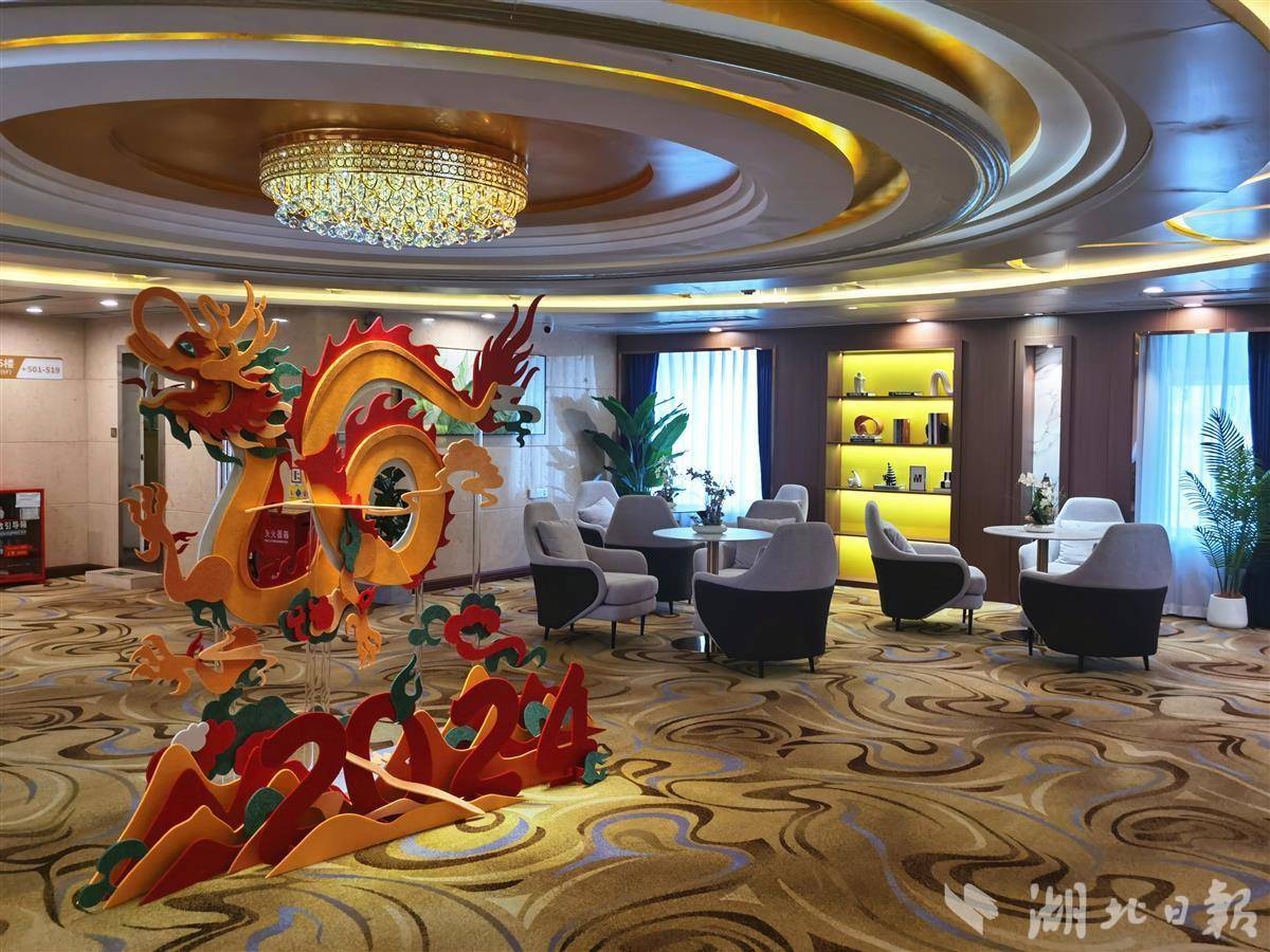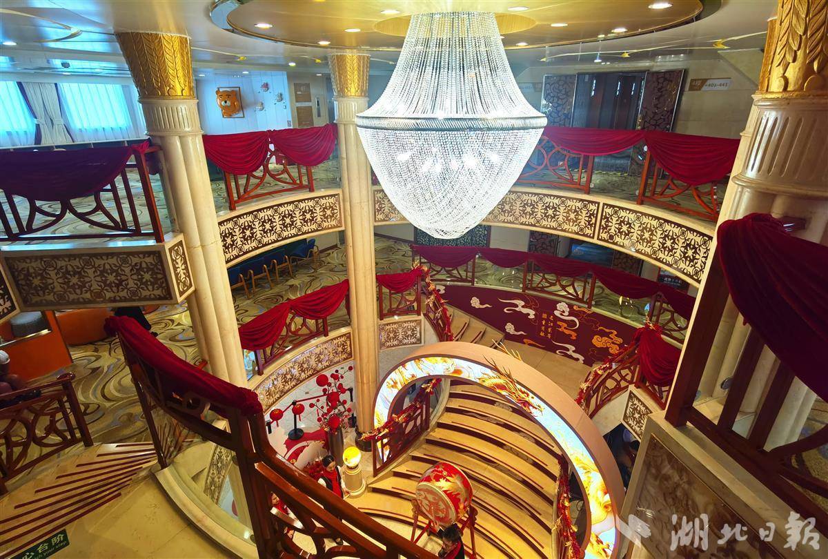 乘电梯来到二楼,贯穿上下三层甲板的中央大厅蔚为壮观。华丽的水晶灯、金色装饰伴随红色幔帐,还有火红的中国龙、福字、窗花等,处处充盈着喜气洋洋的景象。