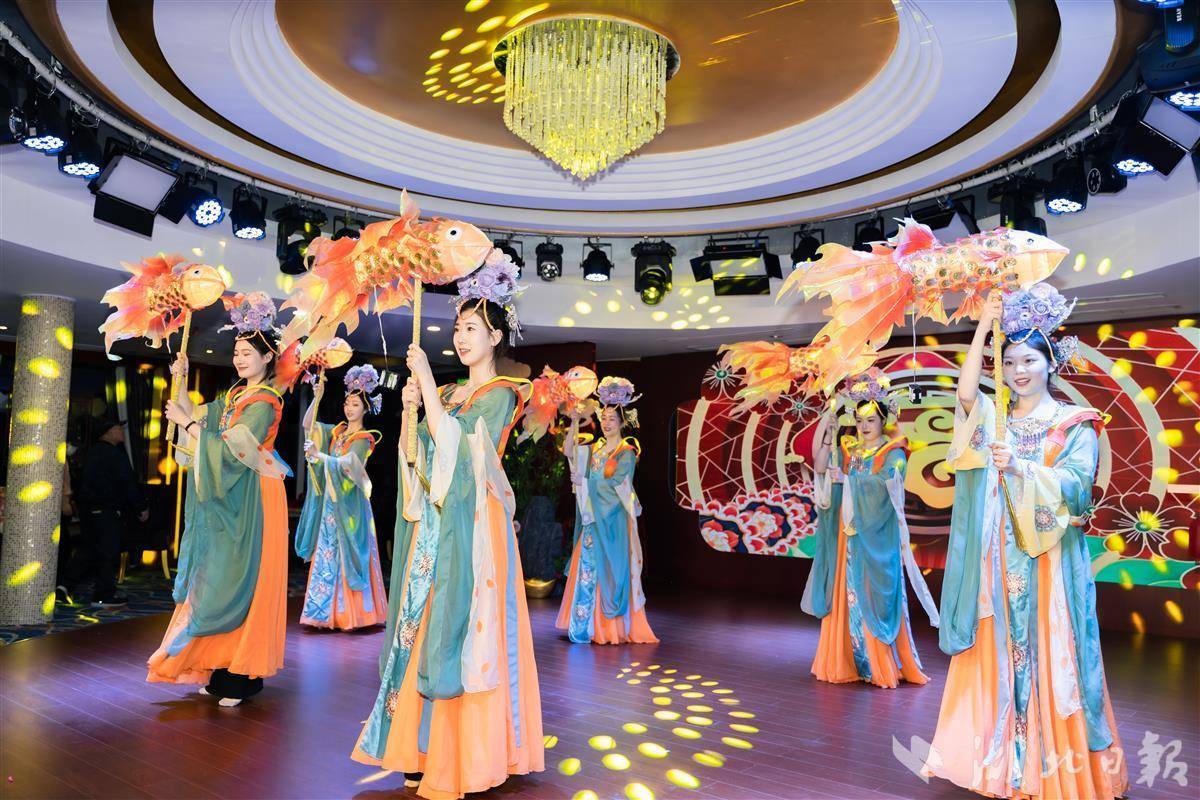 行程单上,在船三晚的晚会主题各有不同,既有梦回唐宋新年晚会,年味十足的鱼灯舞,复古晚会,也有亲子剧场、传统戏法、花式鸡尾酒表演等。
