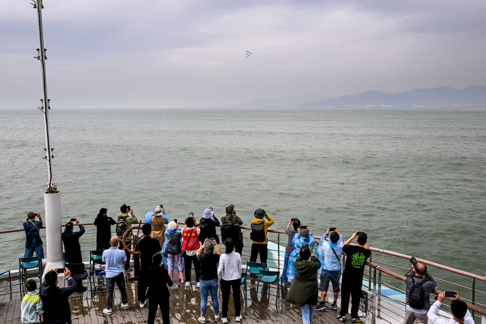 “大湾区二号”游轮上的旅客在珠海金湾机场海域拍摄俄罗斯“勇士”飞行表演队的战机编队。新华社发(唐蜀全摄)