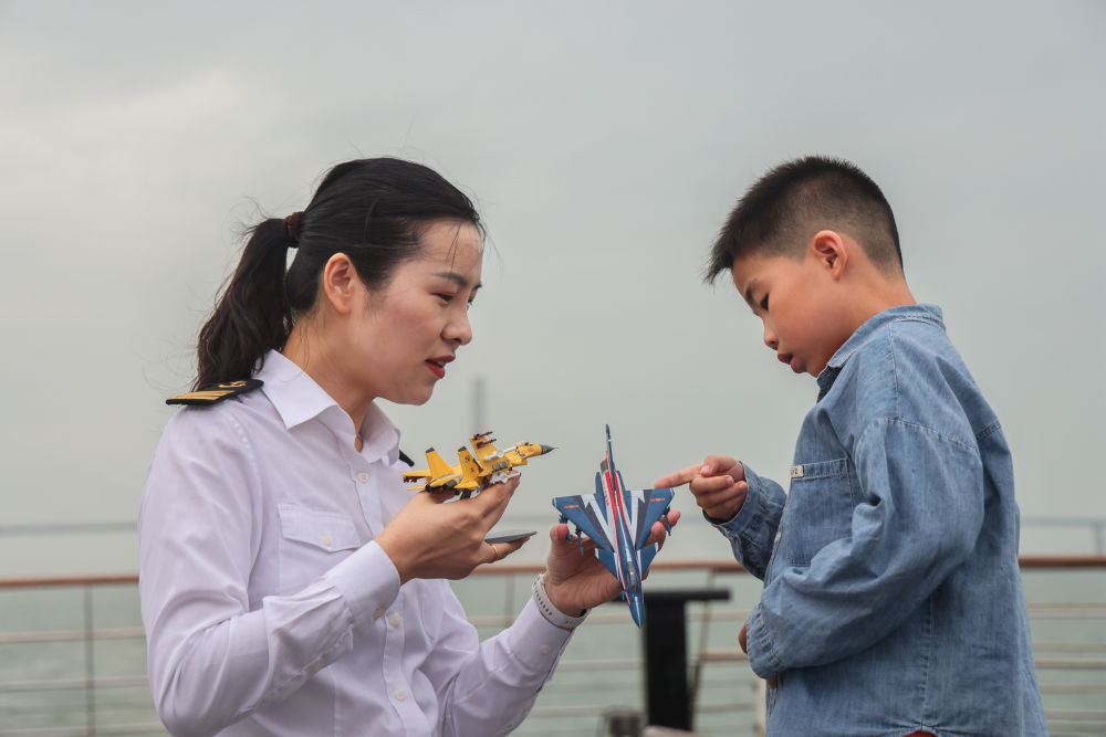 “大湾区二号”游轮大副何倩倩(左)给小游客覃朗介绍战机模型。