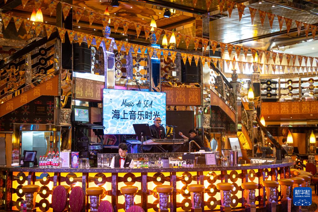 5月27日,在国际邮轮“爱达·地中海”号上,工作人员为游客演出。新华社记者 潘昱龙 摄