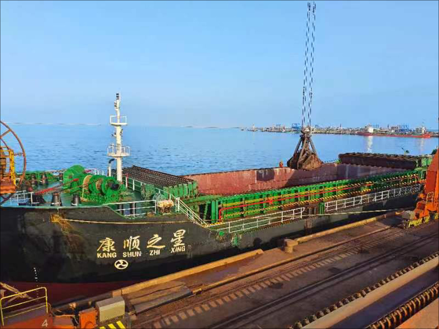 “康顺之星”轮靠港作业期间,公司货运部与生产业务部联手,提前制定作业计划,科学部署生产要素。作业初始,由于物料黏度大、流动性差,当班业务人员及时优化作业流程,由皮带输运改为车辆倒运,有效提升作业效率,减少船舶在港停时。