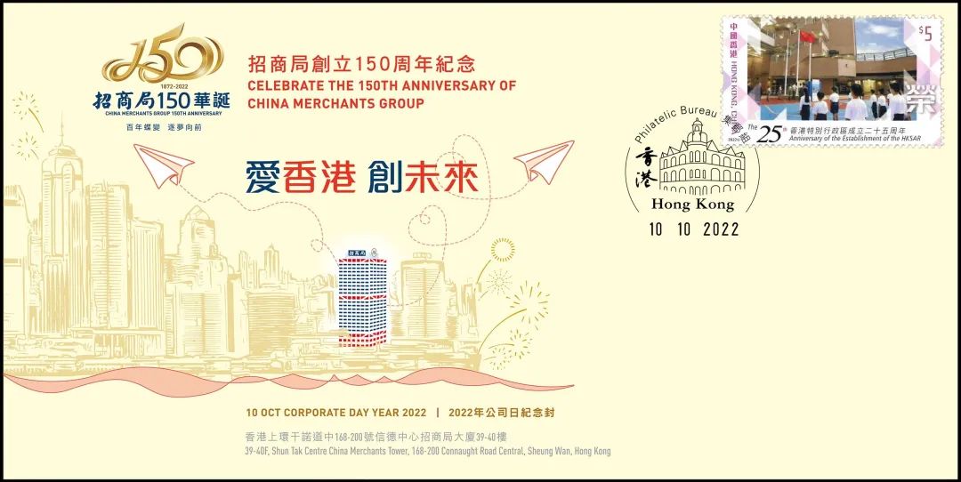 同样于今日推出的《招商局创立150周年》香港纪念封也意义非凡。纪念封以“爱香港 创未来”为主题,通过提取香港维多利亚港招商局总部大楼的剪影为背景主体,配有动感飞机和远方绚烂的烟火点缀,呈现香港欣欣向荣的景象。纪念封整体设计以暖色为主,富有美感,传递了招商局植根香港、积极融入香港,以商业成功与香港共创美好未来的决心和信念。